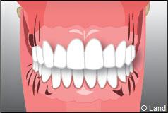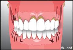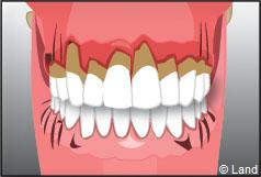 Les tissus de soutien de la dent sont touchés, l’inflammation et l’infection progressent. Les récessions gingivales apparaissent.